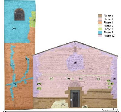 Phases de construction de la facade de l'église romane Sant'Agata dell Mugello (Toscane, Italie) identifiées par analyse stratigraphique.