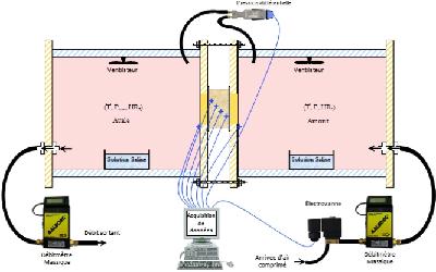 Concevoir un système représentatif, à l'échelle du matériau, pour la régulation de température, d'humidité relative et d'air d'une paroi. L'objectif principal est de réaliser une cellule régulée en débit et en humidité relative permettant de garantir les conditions hygrothermiques de confort dans une ambiance représentative de celle du bâtiment (à droite sur la figure), à partir des conditions environnementales extérieures (à gauche sur la figure). Le matériau est placé entre les deux ambiances.